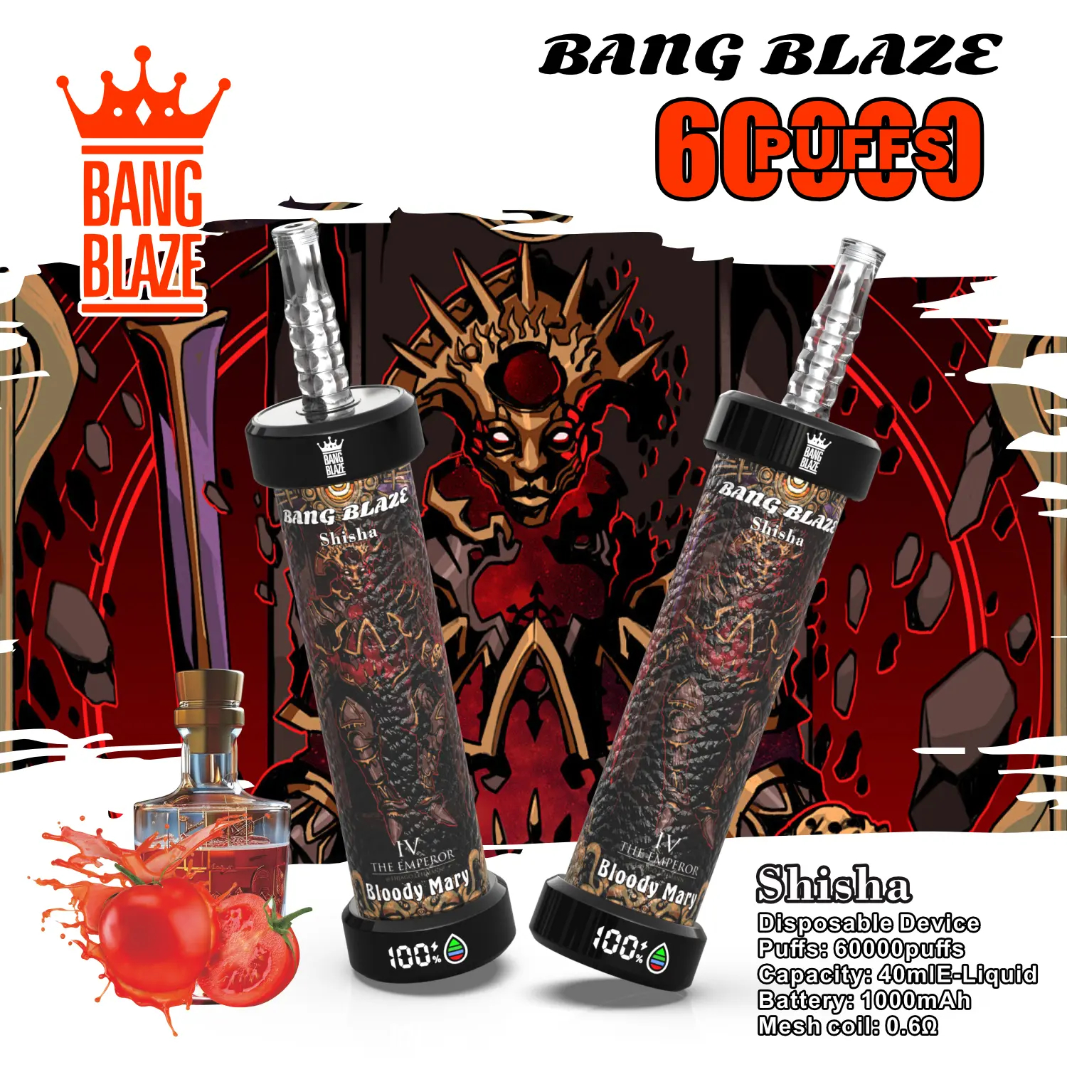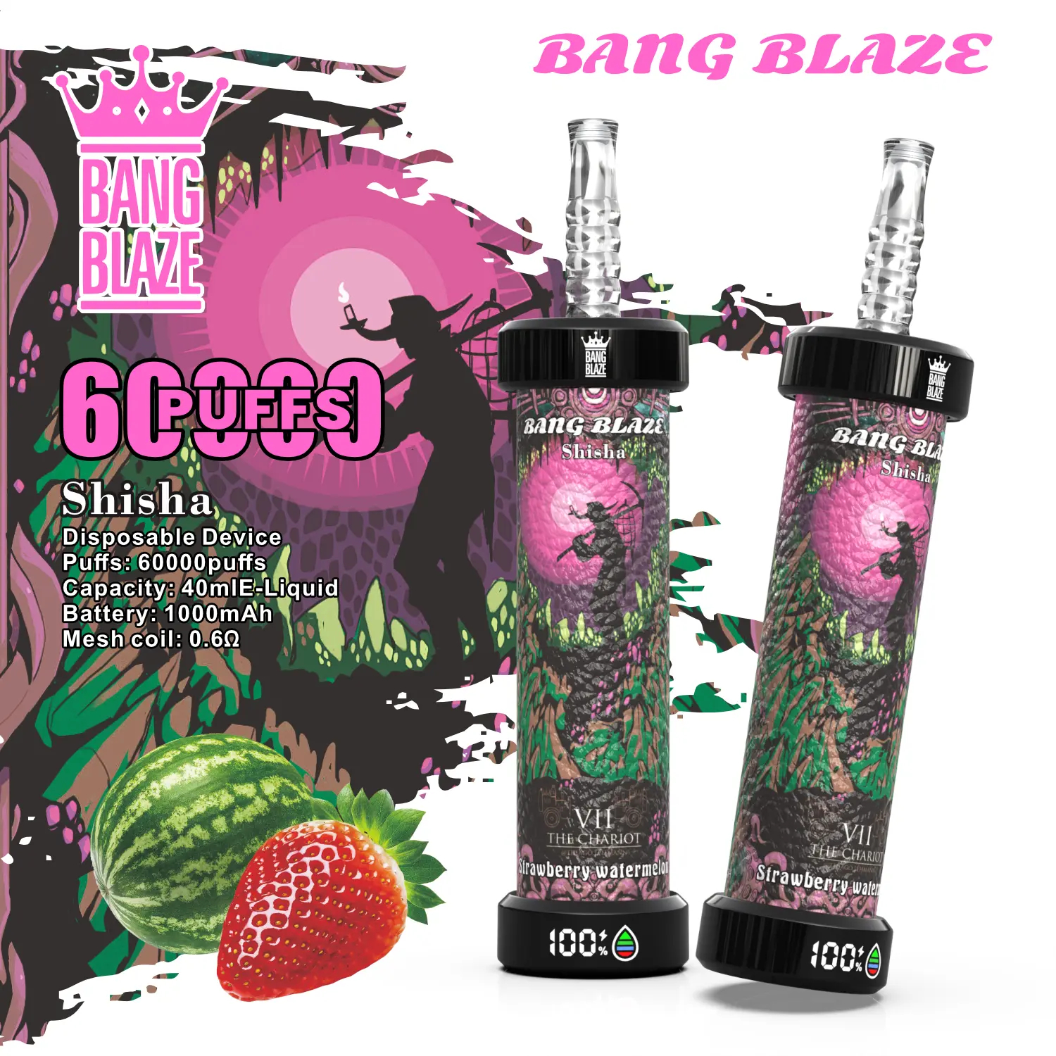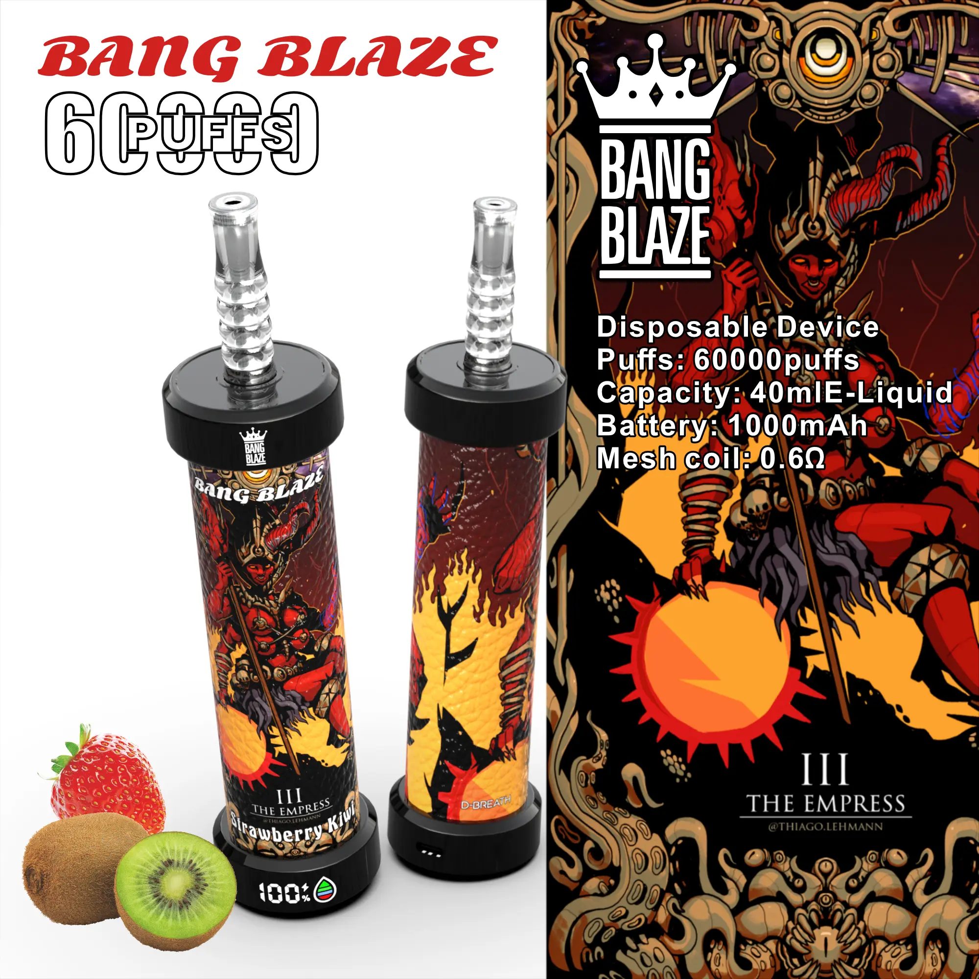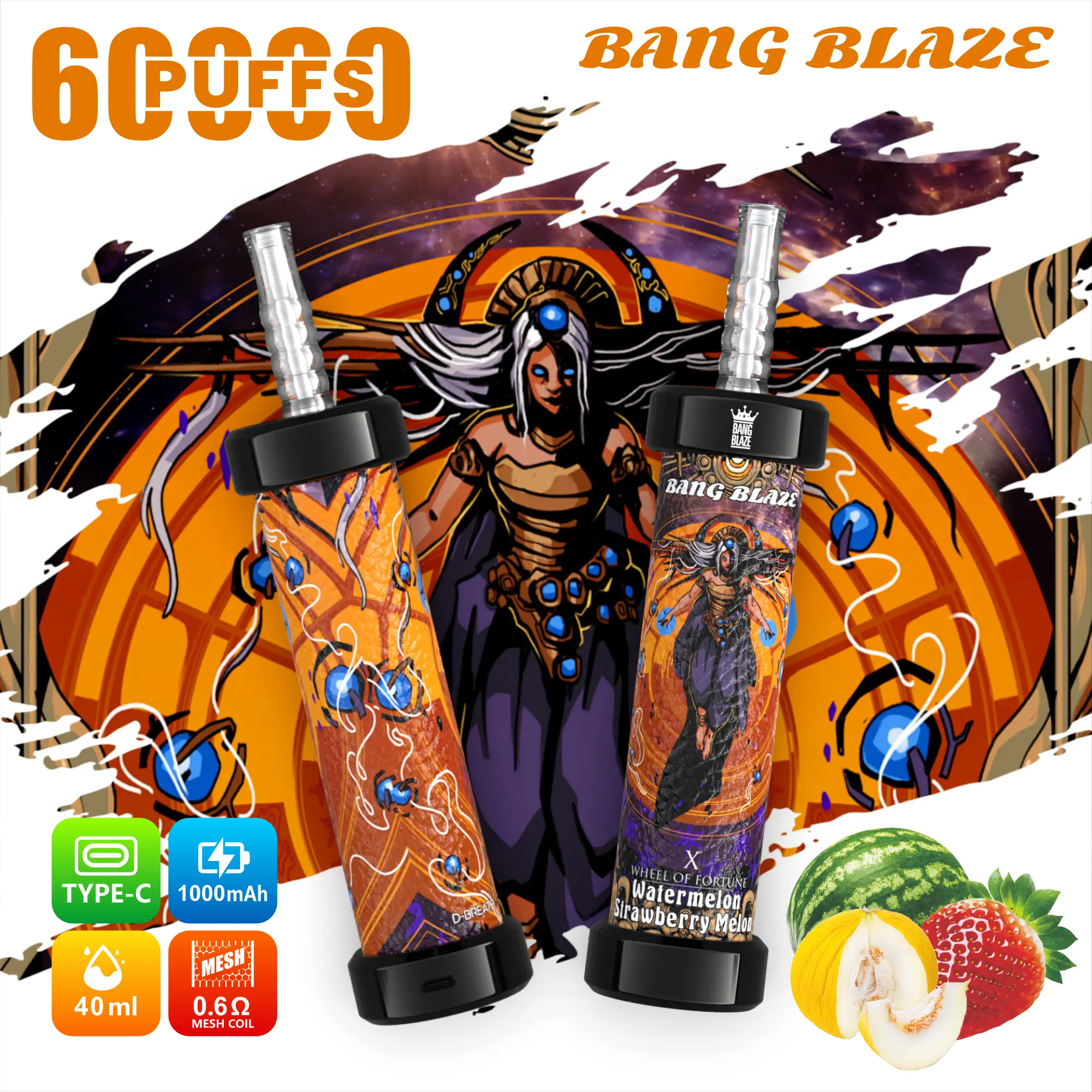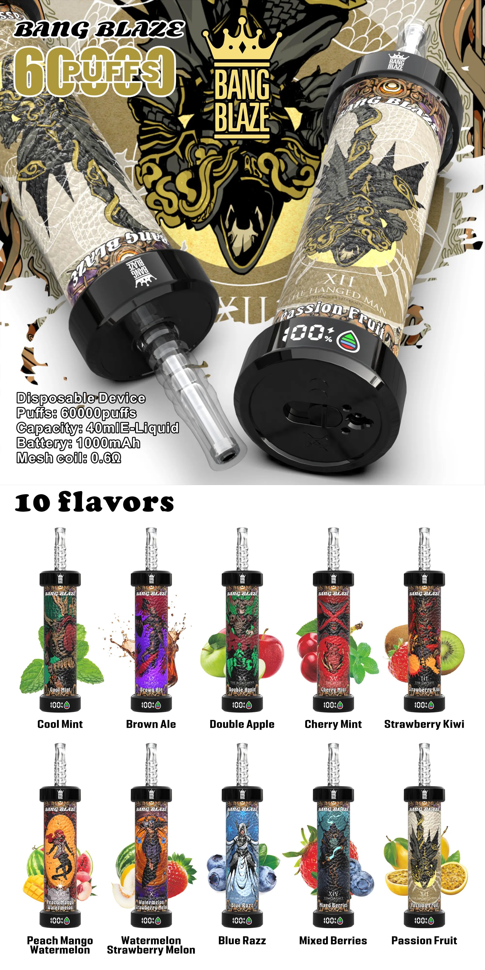 1.PUFFS:60000 2.E liquid : 40ml 3.Battery: 1000 mah 4.Resistance: 0.6ohm